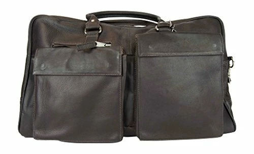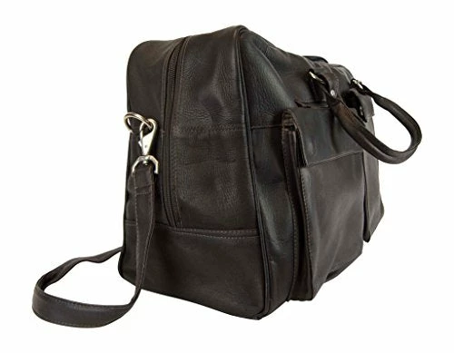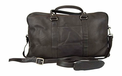 - Classic leather duffel with brushed metallic hardware, dual top handles, and removable/adjustable strap