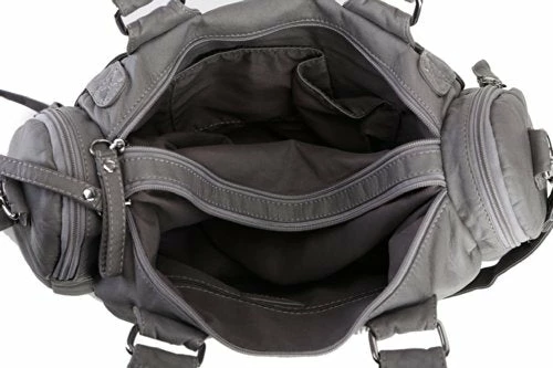 - Two large interior compartments; one with a cell phone pocket, the other has a small zipper pocket. Exterior double snap closure pocket.