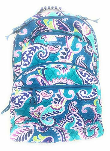 Details: Vera Bradley quilted cotton Large essential backpack. Polyester lining Two exterior front zip pockets; Two exterior side slip pockets Inner padded laptop sleeve Flat Bottom Lining made of polyester Adjustable strap canvas Measures 17″ x 12″ x 5″