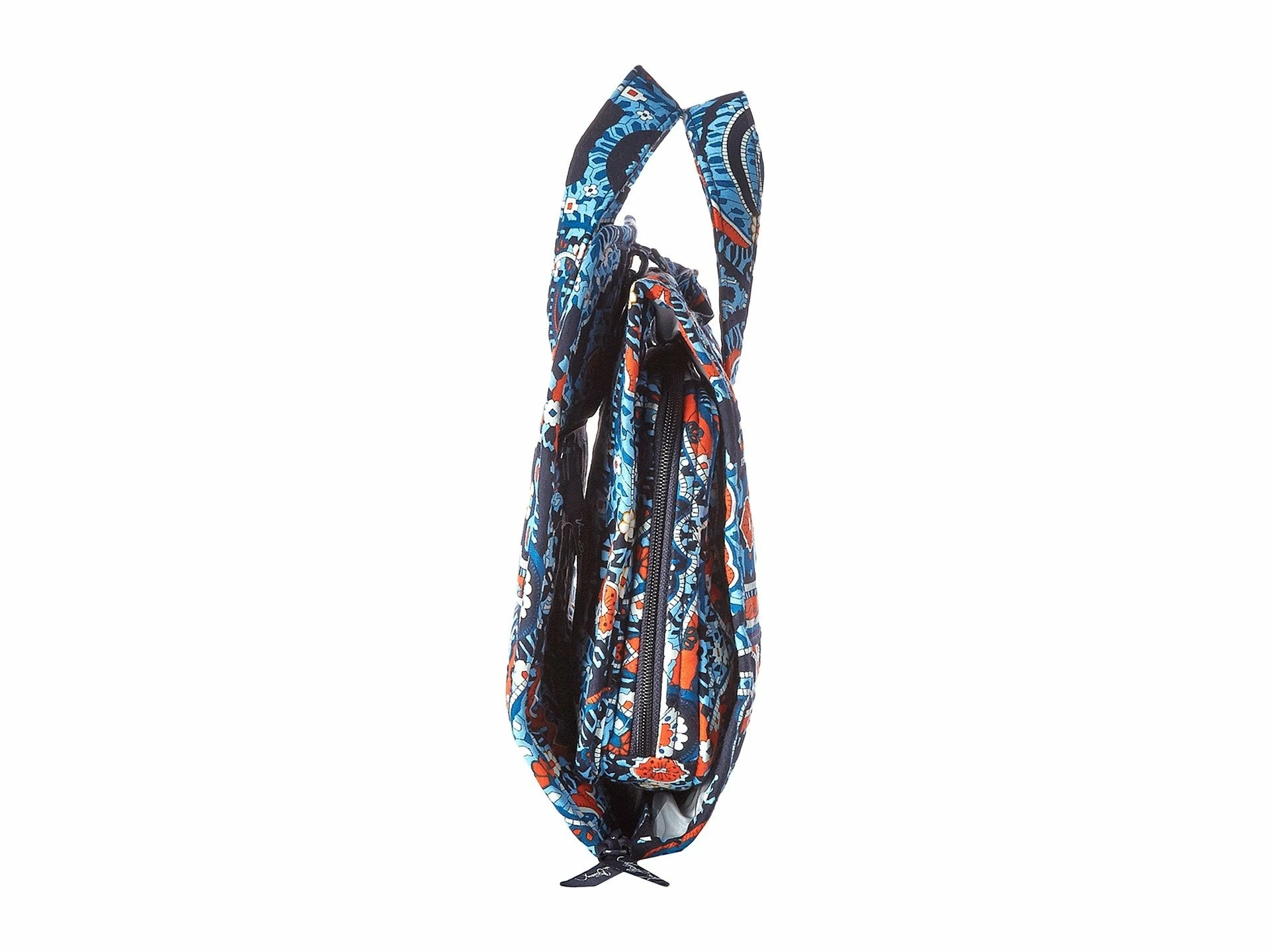 - Gusseted plastic-lined bottom compartment opens wide when unzipped