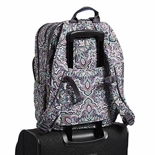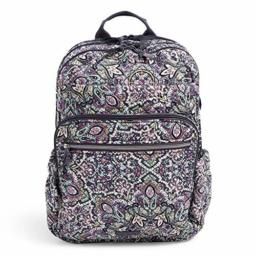 Details: Our quilted cotton is colorful and lightweight. Exterior features 2 side slip pockets, a u-shaped front zip compartment, a front zip pocket, a hidden zip front pocket and a back hidden zip pocket. Front u-shaped zip compartment contains 4 slip pockets, 3 pen slips and an ID window. Front compartment. Middle compartment features 2 mesh slip pockets and a large slip pocket (perfect for a tablet). Padded laptop compartment. Padded shoulder straps are shaped for optimum comfort on body, and feature an adjustable chest strap buckle for weight distribution. Both back panel and trolley sleeve are padded for comfort. Zip closures. Accommodates up to a 15″ laptop. Machine was cold gentle cycle. Use non-chlorine bleach as needed, line dry. Fits Up to 15″ Laptop Vera Bradley is your back to school destination! Our back packs are perfect for back to school, work, and travel, including backpacks for men, backpacks for women, backpacks for girls, and backpacks for boys. Our bookbags have plenty of organization, whether you are shopping for a large backpack or a mini backpack.